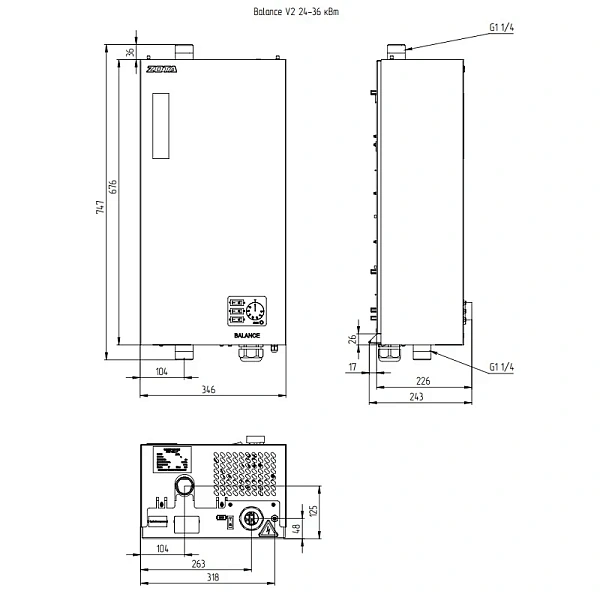 - присоединительные размеры патрубков 1'' (котлы 3-15 кВт), 1 1/4" (котлы 18-36 кВт).