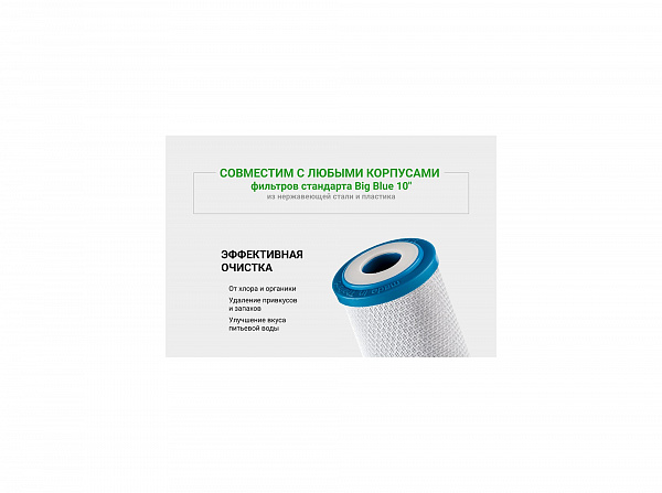 Картридж CBC 10 – 10ВВ изготовлен из высококачественного кокосового активированного угля по технологии карбон-блок, что обеспечивает глубокую очистку воды от хлора, органических и хлорорганических соединений. Устраняет неприятные запахи и улучшает вкус воды. Характеристики