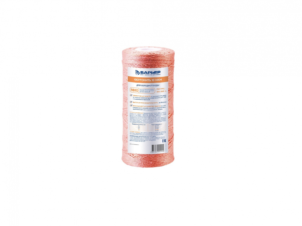 Картридж БАРЬЕР «Ферронить» эффективно удаляет механические частицы от 10 мкм, примеси растворенного и коллоидного железа, а также справляется с тяжелыми металлами. Внешний розовый слой – активированная нить, способная эффективно поглощать железо, марганец и другие тяжелые металлы. Внутренний белый слой – намотка специально обработанной полипропиленовой нити. Она задерживает мелкую взвесь, а также частицы нерастворенного железа. Благодаря переменной намотке тонкость фильтрации картриджа изменяется от 5 до 1 мкм. Ресурс до 256 000 литров. Подходит к любым проточным фильтрам стандарта Big Blue"10. Допустимо использование только в холодной воде от +5 до +35 градусов, производительность до 20 литров в минуту.