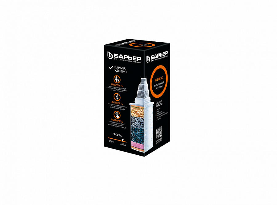Картридж для кувшина БАРЬЕР для очистки городской воды с высоким содержанием растворенного железа в пределах до 3 ПДК. Удаляет неприятный металлический привкус, делает воду прозрачной. Даёт базовую очистку от хлора, его подобных продуктов, тяжелых металлов. Ресурс зависит от качества исходной воды, но составляет не более 350 литров. Подходит для железистой воды. Характеристики