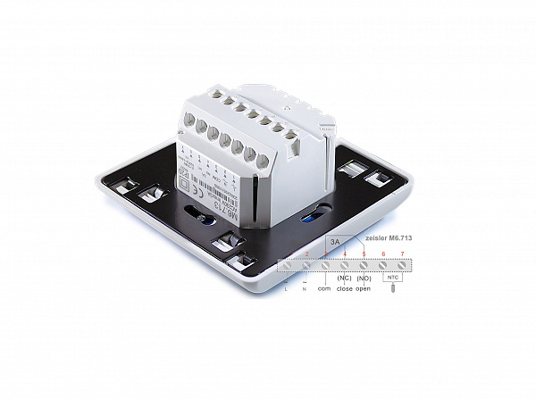Встраиваемый програмируемый по часам (6 периодов в сутки) и дням недели терморегулятор ZEISSLER M6.713. Применяется для управления элементами водяных систем отопления (горелками, котлами, термоэлектрическими приводами и т.д.). Имеет выносной датчик, встроенный датчик температуры воздуха, LCD экран, нормально открытый (NO) и нормально закрытый (NC) контакт. Диапазон регулировки температуры воздуха от +10°C до +55°C. Диапазон регулировки температуры выносного датчика в режиме защиты от перегрева от +5°C до +60°C. Диапазон регулировки температуры выносного датчика в режиме регулирования от +35°C до +95°C . Максимальный коммутируемый ток 3А. Характеристики