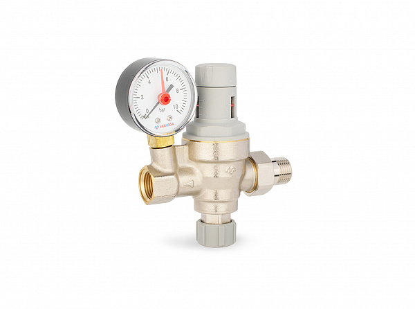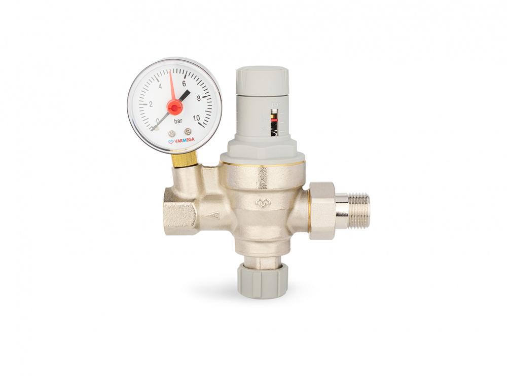 Манометр-индикатор позволяет контролировать давление в сети после клапана и производить настройку требуемого давления.