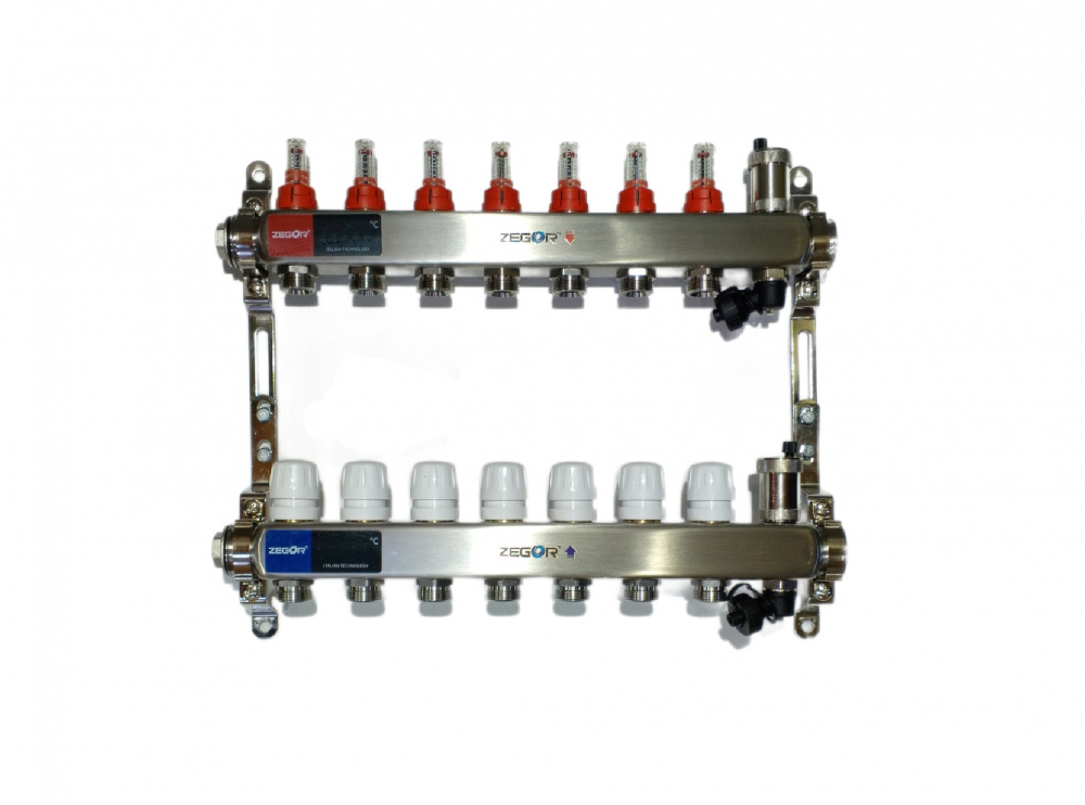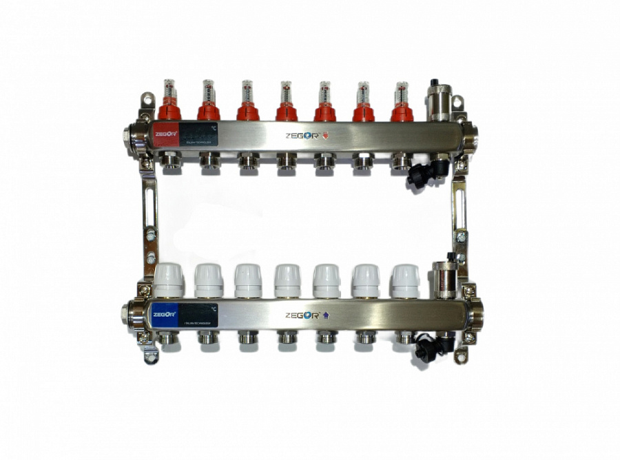 Коллекторная группа Zegor из нержавеющей стали 1" на 11 контуров с расходомерами и автоматическим воздухоотводчиком