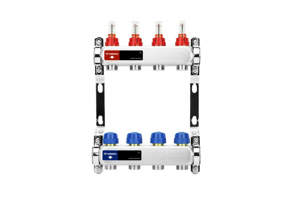 Коллекторные группы предварительной сборки из нержавеющей стали с расходомерами марки Varmega предназначены для распределения и регулирования потоков теплоносителя в низкотемпературных системах отопления (напольное отопление). Оснащены расходомерами на подающем коллекторе и термостатическими вентилями с размером M30x1,5 (с возможностью установки термоэлектрических приводов) на обратном коллекторе. Каждый коллектор подвергается в заводских условиях проверке на функционирование и герметичность уплотнений. Характеристики