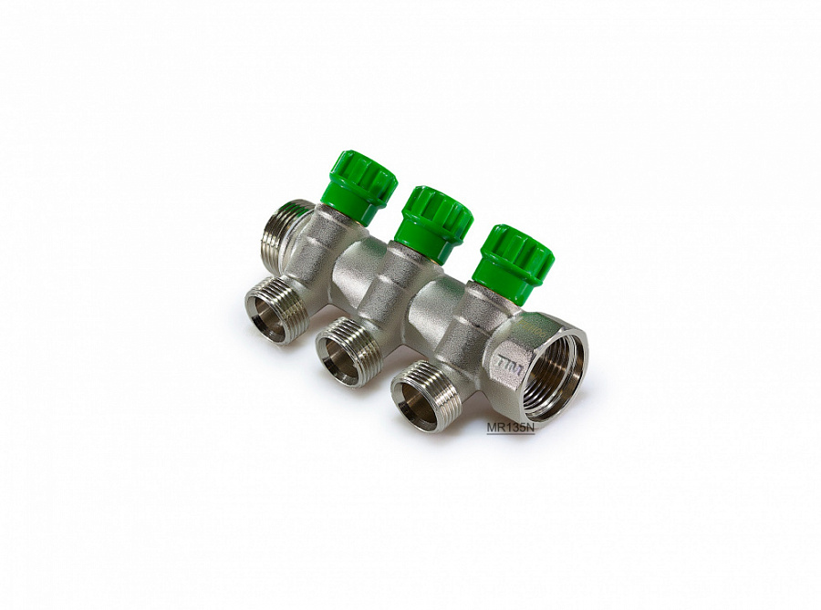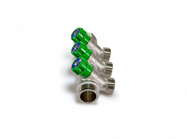 Распределительный коллектор 1" (Ду25) с наружной и внутренней резьбой для лучевых систем водоснабжения. Имеет 3 отвода под 45° с присоединительным размером 3/4" евроконус. Регулировочные вентили (кран-буксы) позволяют отключить или регулировать проток. Так же может применяться для распределения и балансировки потоков жидкостей в контурах теплого пола, радиаторного отопления. Температура перекачиваемой жидкости до 110 °С, давление - до 10 бар. Характеристики