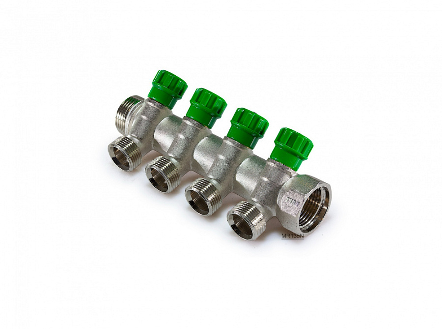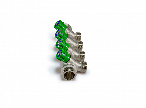 Распределительный коллектор 1" (Ду25) с наружной и внутренней резьбой для лучевых систем водоснабжения. Имеет 4 отвода под 45° с присоединительным размером 3/4" евроконус. Регулировочные вентили (кран-буксы) позволяют отключить или регулировать проток. Так же может применяться для распределения и балансировки потоков жидкостей в контурах теплого пола, радиаторного отопления. Температура перекачиваемой жидкости до 110 °С, давление - до 10 бар. Характеристики