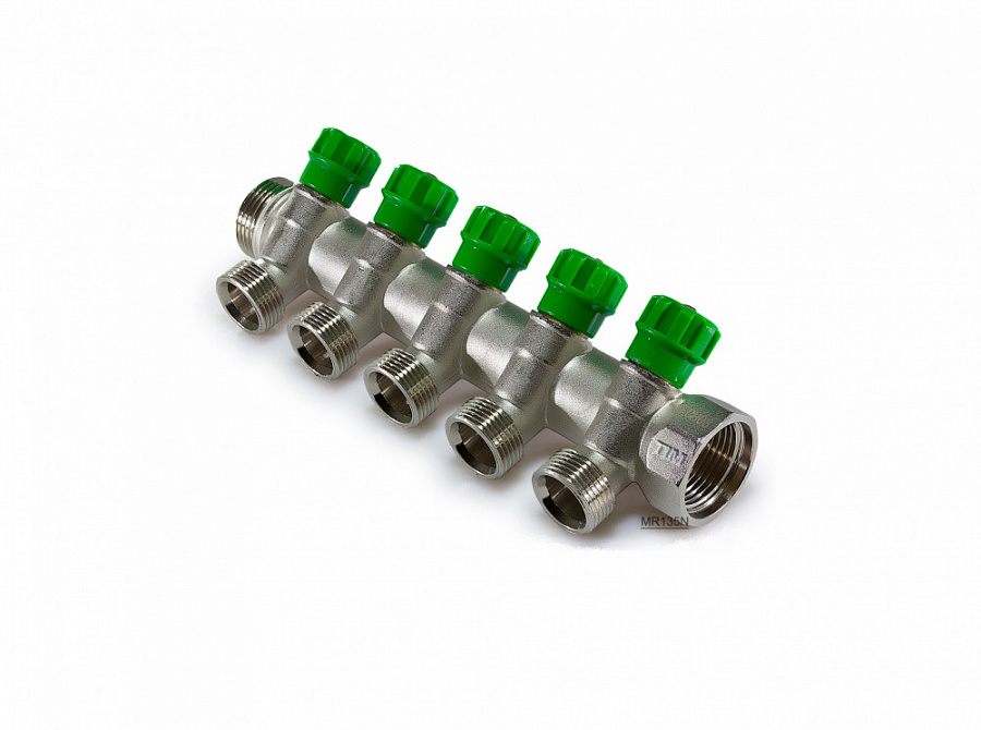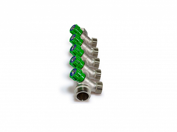 Распределительный коллектор 1" (Ду25) с наружной и внутренней резьбой для лучевых систем водоснабжения. Имеет 5 отводов под 45° с присоединительным размером 3/4" евроконус. Регулировочные вентили (кран-буксы) позволяют отключить или регулировать проток. Так же может применяться для распределения и балансировки потоков жидкостей в контурах теплого пола, радиаторного отопления. Температура перекачиваемой жидкости до 110 °С, давление - до 10 бар. Характеристики