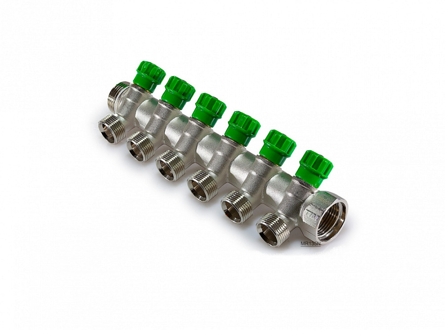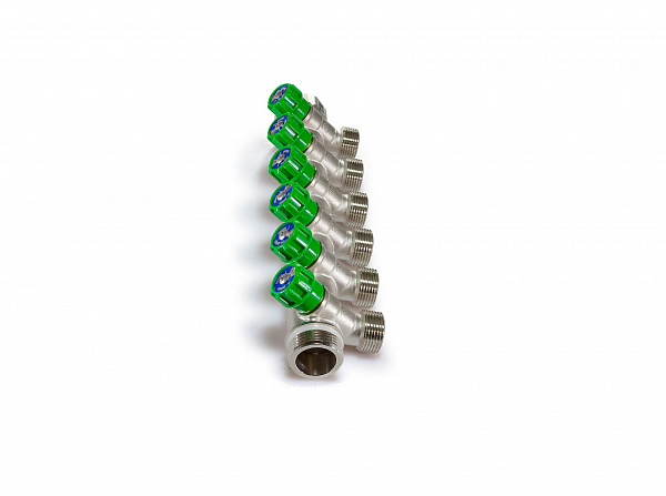 Распределительный коллектор 1" (Ду25) с наружной и внутренней резьбой для лучевых систем водоснабжения. Имеет 6 отводов под 45° с присоединительным размером 3/4" евроконус. Регулировочные вентили (кран-буксы) позволяют отключить или регулировать проток. Так же может применяться для распределения и балансировки потоков жидкостей в контурах теплого пола, радиаторного отопления. Температура перекачиваемой жидкости до 110 °С, давление - до 10 бар. Характеристики