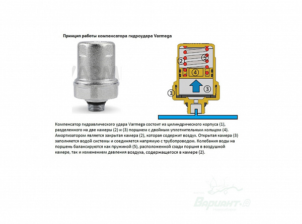 Компенсатор гидроудара Varmega предназначен для компенсации (гашения) резких скачков давления (гидравлических ударов), которые возникают в закрытых трубопроводах, когда поток воды подвергается торможению или ускорению за очень короткие промежутки времени, по причине воздействия быстрого перекрывания клапанов и кранов или по причине отключения циркуляционного насоса.