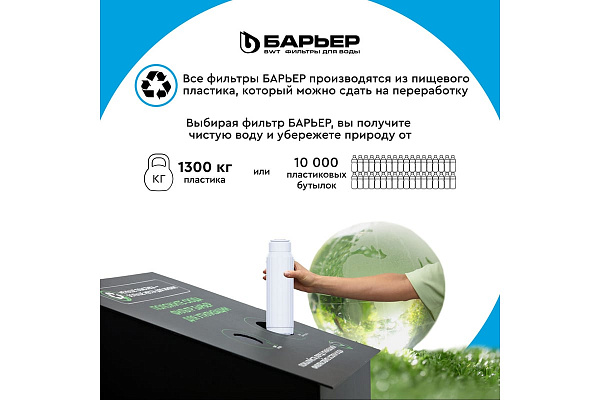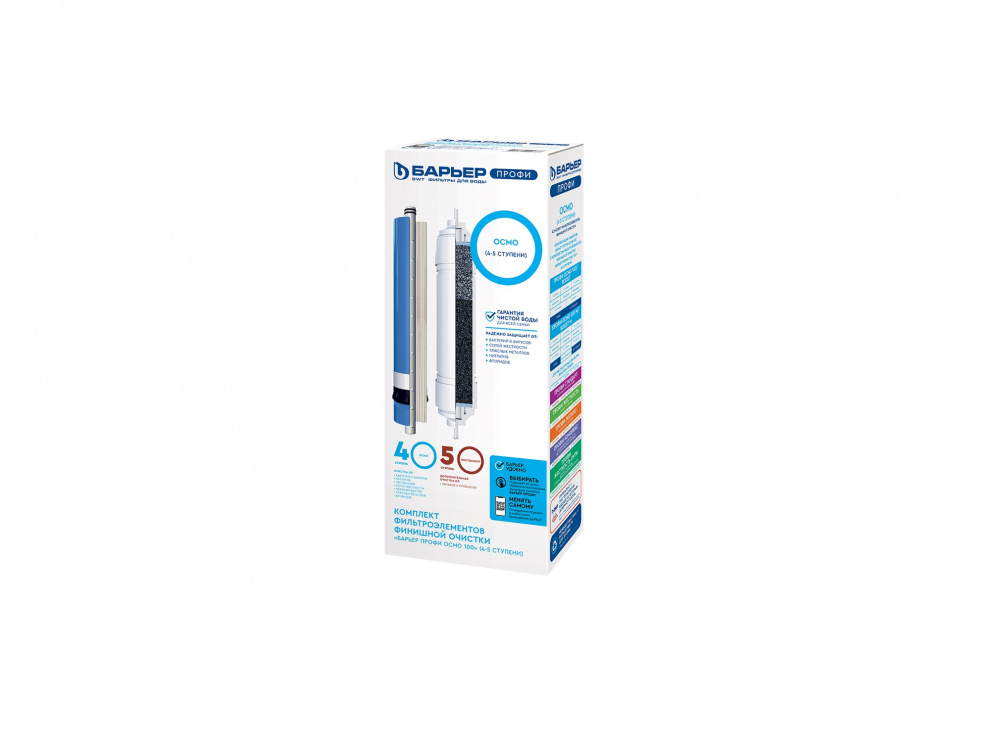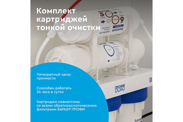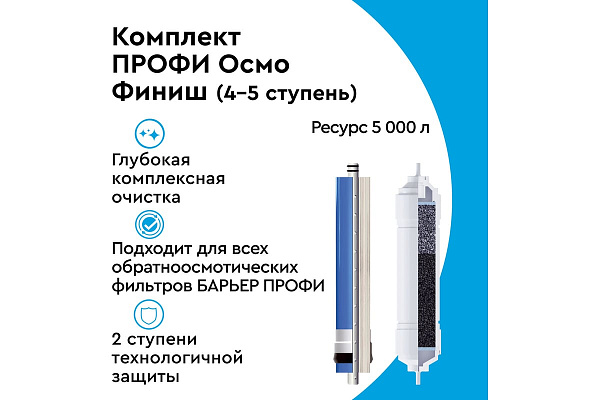 Комплект финишных картриджей для обратноосмотического фильтра семейства ПРОФИ ОСМО. Совместим с фильтрами стандарта SL 10. В комплект входит: БАРЬЕР ПРОФИ Осмо 100 - обратноосмотическая мембрана на основе тонкоплёночного полиамидного композита с размером пор 0,0001 мкм пропускает только молекулы воды, за счет чего удаляются абсолютно все примеси. Позволяет получить кристально чистую воду, не уступающую по качеству бутилированной. Производительность мембраны 100 галлон, ресурс мембраны до 2 лет. БАРЬЕР ПРОФИ Постфильтр – финишное кондиционирование после накопительной емкости. Удаление привкусов и запахов. Ресурс картриджа 10 000 литров. Характеристики