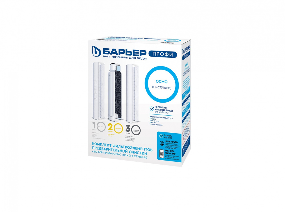 Комплект картриджей для обратноосмотического фильтра семейства ПРОФИ ОСМО. Устанавливается в качестве 1-3 ступеней, подготавливает воду к обратноосмотической мембране. Совместим с фильтрами стандарта SL 10. В комплект входит: БАРЬЕР ПРОФИ Механика 5 мкм – предварительная механическая очистка. Удаление ржавчины, песка и других примесей. БАРЬЕР ПРОФИ Сорбцион – защита мембраны от хлора. БАРЬЕР ПРОФИ Механика 1 мкм - финишная механическая очистка нерастворимых мелкодисперсных примесей размером до 1 мкм. Ресурс комплекта до 12 месяцев. Характеристики