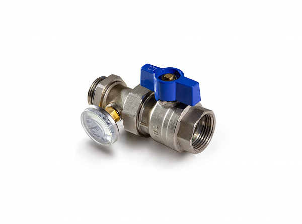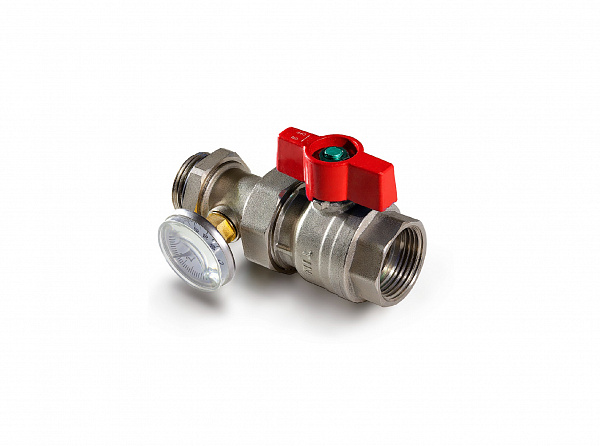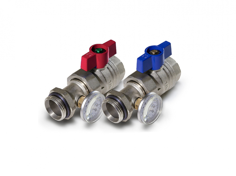 Комплект кранов 1" с термометрами и накидной гайкой (американкой) для подключения коллекторной группы теплого пола к узлу смешения. Кран с красной ручкой бабочкой устанавливается на подающую линию, с синей на обратную линию. Термометры имеют резьбовое соединение с телом крана и позволяют контролировать разницу температур. Характеристики