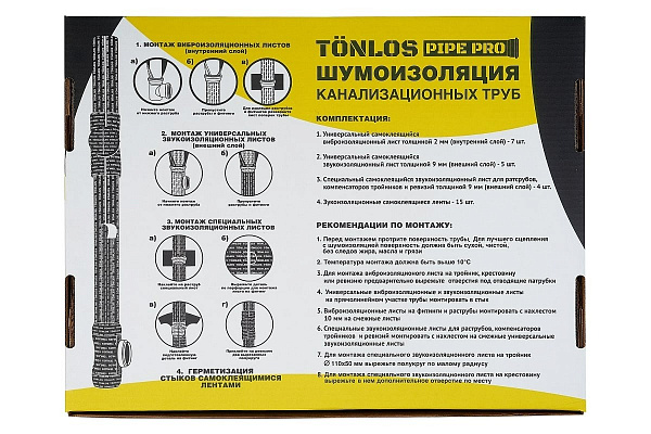 В наборе Tonlos PIPE PRO 7 универсальных виброизоляционных листов, 5 универсальных звукоизоляционных листов, 4 специальных звукоизоляционных листа для раструбов, компенсаторов, тройников и ревизий и 20 самоклеящихся лент.