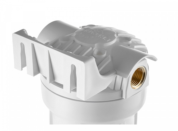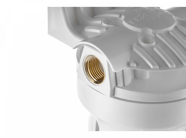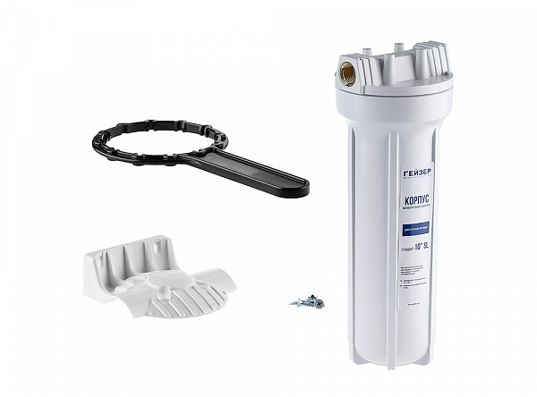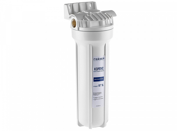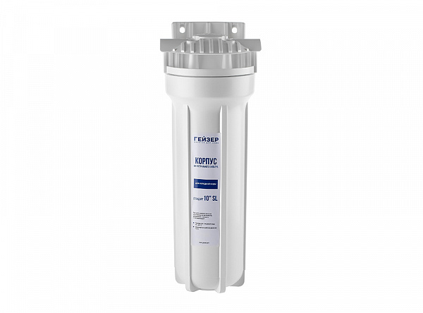 Корпус Гейзер 10SL изготовлен из белого полипропилена с латунными вставками и пластмассовой скобой . Корпус рассчитан на работу под давлением и установку на входе в систему холодного водоснабжения. В производстве корпусов используется материалы пищевого класса. Характеристики
