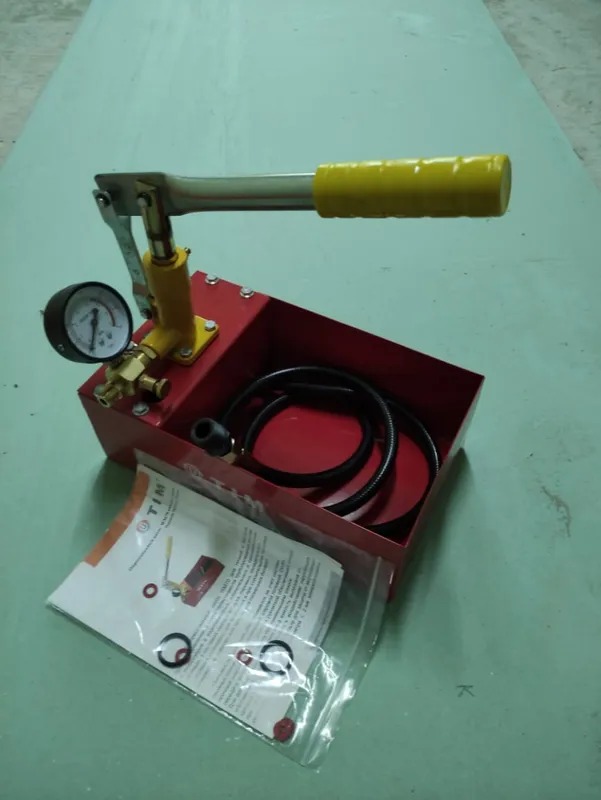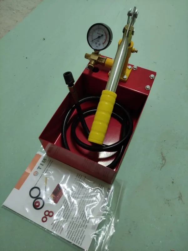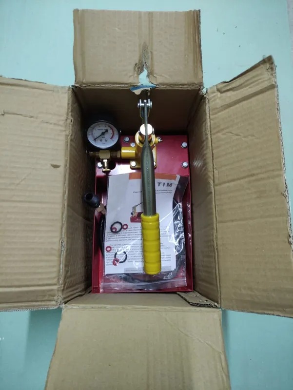 Подача воды осуществляется из емкости самого опрессовщика, давление жидкости отображается на встроенном в аппарат манометре.