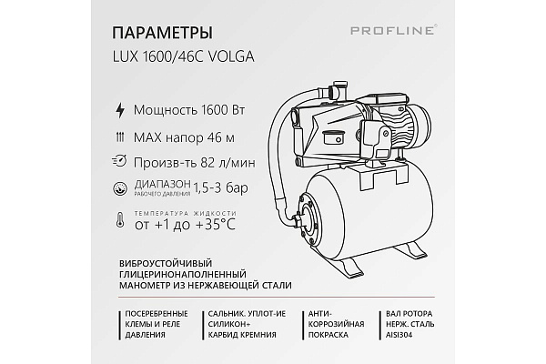 Насосная станция PROFLINE LUX 1600/46C Volga с гидроаккумулятором 50 литров, подъем до 46 м