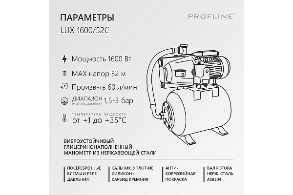 Насосная станция PROFLINE LUX 1600/52C с гидроаккумулятором 24 литра, подъем до 53 м