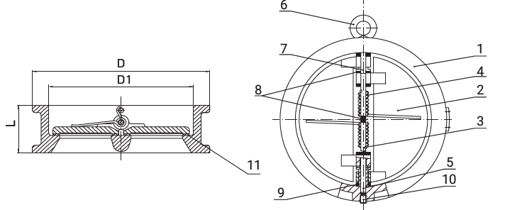Двухстворчатый клапан состоит из корпуса, пластин, пружины, штока и уплотнения. Корпус клапана изготавливается из серого чугуна, запорные пластины – из высокопрочного чугуна, покрытого никелем, шток клапана и пружина – из нержавеющей стали, седловое уплотнение из EPDM.