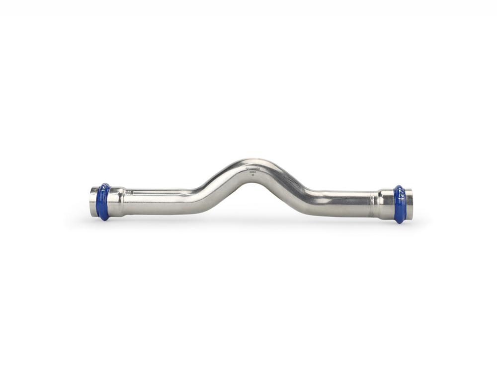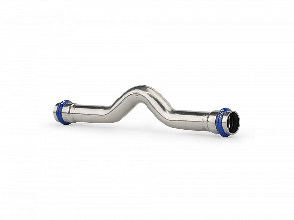 Обвод двухраструбный Varmega Inox Press равносторонний, используется для обхода препятствий или изменения направления линии трубопровода при прокладке инженерных коммуникаций. Для получения надежного неразъемного соединения трубы и фитинга потребуется специальный пресс-инструмент с насадками типа профиль «V».