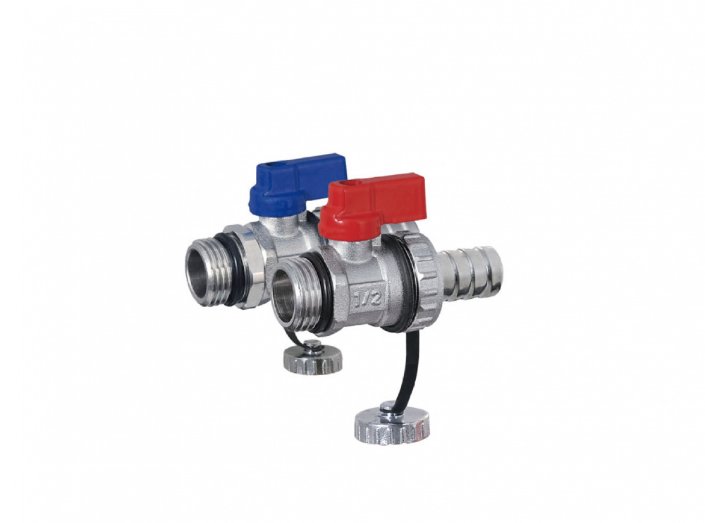 Комплект дренажных кранов 1/2" с наружной резьбой и переходом на штуцер для присоединения шланга Ø 12 мм или заглушку. Для удобства имеют ручки флажки красного и синего цвета. Применяются для заполнения и опорожнения теплого пола, общей системы отопления, систем водоснабжения и т.д. Характеристики