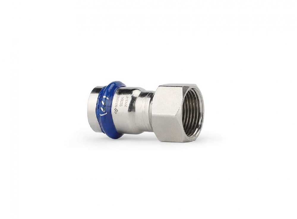 Муфта с внутренней резьбой Varmega Inox Press с одной стороны имеет раструбное соединение для трубы, а с другой стороны фитинга находится внутреннее резьбовое соединение. Данный фитинг позволяет присоединить к трубопроводу различные резьбовые элементы (краны, фильтры и т. п.), также дает возможность подключиться к другому типу трубопровода. Для получения надежного неразъемного соединения трубы и фитинга потребуется специальный пресс-инструмент с насадками типа профиль «V».