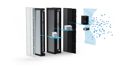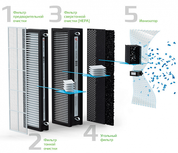 Комбинированный фильтр: HEPA медицинского класса очистки Н12 блокирует 99,95% мелких частиц (пыльцу, споры грибов, шерсть, аллергены, вирусы, плесневые грибы).