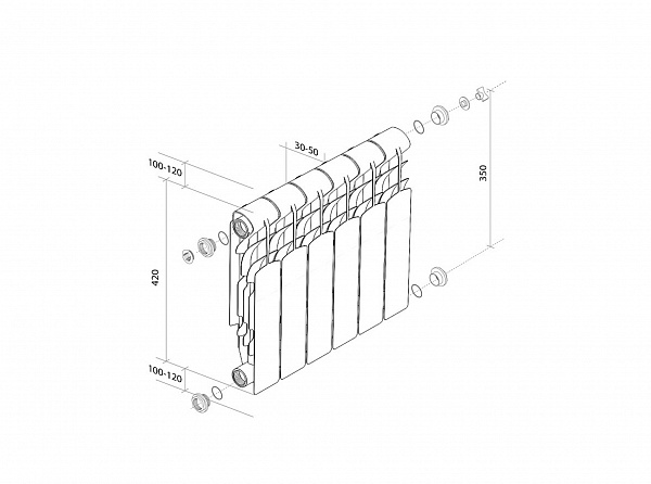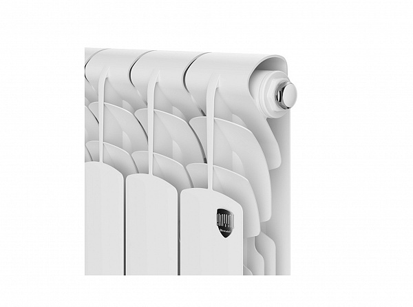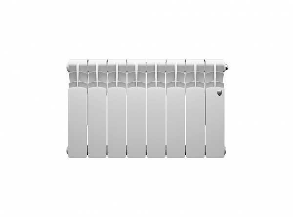 Алюминиевый секционный радиатор для автономных систем отопления (дача, коттедж и т.д.). При высоте потолка 2.5 - 2.75 м и средних теплопотерях 8 секции Royal Thermo Revolution с межосевым расстоянием 350 мм достаточно для обогрева 10-11 м2. Характеристики