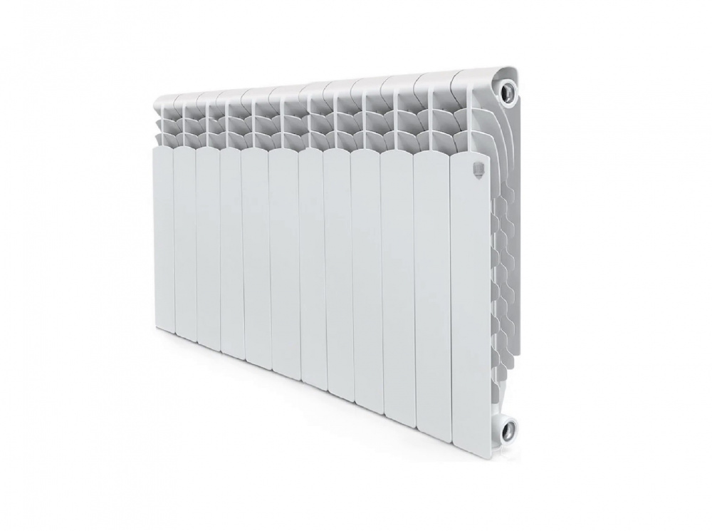Алюминиевый секционный радиатор для автономных систем отопления (дача, коттедж и т.д.). При высоте потолка 2.5 - 2.75 м и средних теплопотерях 12 секции Royal Thermo Revolution с межосевым расстоянием 500 мм достаточно для обогрева 20-21 м?. Характеристики