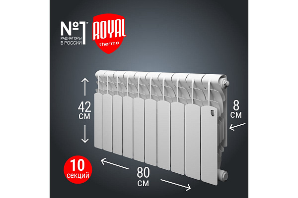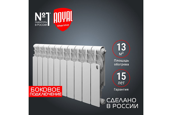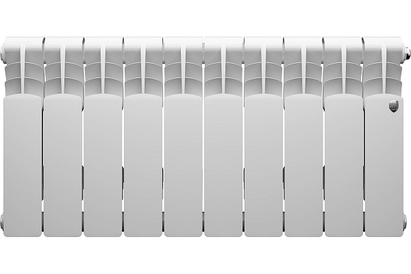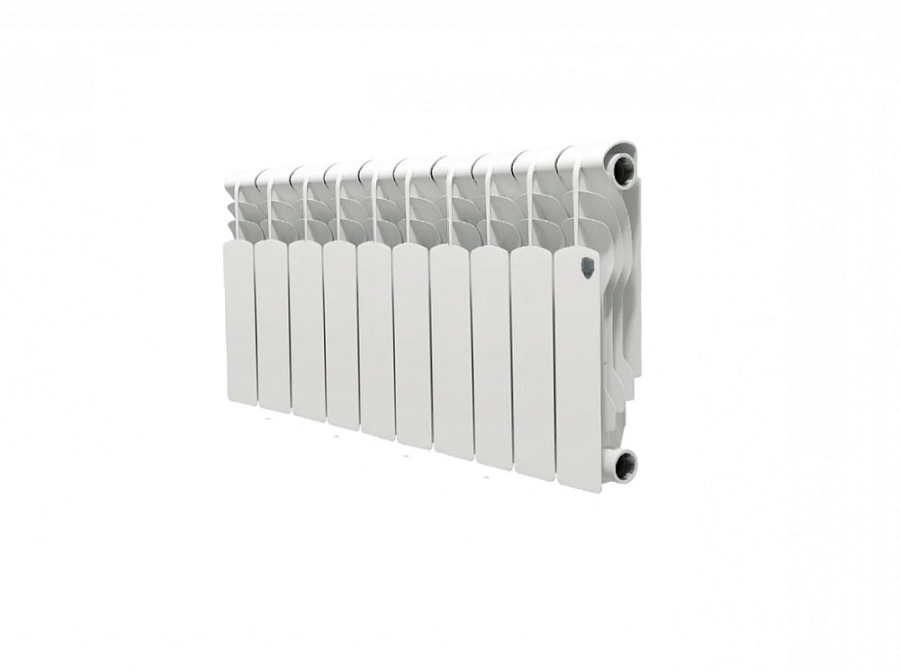 Биметаллический секционный радиатор для центральных систем отопления (квартира, офис и т.д.). Представляест собою алюминиевый радиатор с усиленным стальным коллектором, более стоиким к агрессивным теплоносителям. При высоте потолка 2.5 - 2.75 м и средних теплопотерях 10 секции Royal Thermo Revolution Bimetall с межосевым расстоянием 350 мм достаточно для обогрева 11-12 м?. Характеристики
