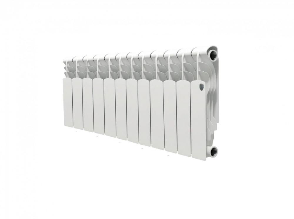 Биметаллический секционный радиатор для центральных систем отопления (квартира, офис и т.д.). Представляест собою алюминиевый радиатор с усиленным стальным коллектором, более стоиким к агрессивным теплоносителям. При высоте потолка 2.5 - 2.75 м и средних теплопотерях 12 секции Royal Thermo Revolution Bimetall с межосевым расстоянием 350 мм достаточно для обогрева 13-14 м?. Характеристики