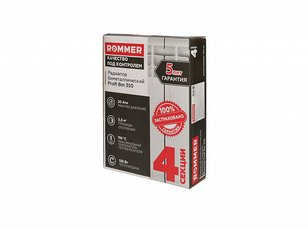 Биметаллический секционный радиатор для центральных систем отопления (квартира, офис и т.д.). Представляест собою алюминиевый радиатор с усиленным стальным коллектором, более стоиким к агрессивным теплоносителям. При высоте потолка 2.5 - 2.75 м и средних теплопотерях 4 секции Rommer Profi Bm с межосевым расстоянием 350 мм достаточно для обогрева 3-4 м?. Характеристики