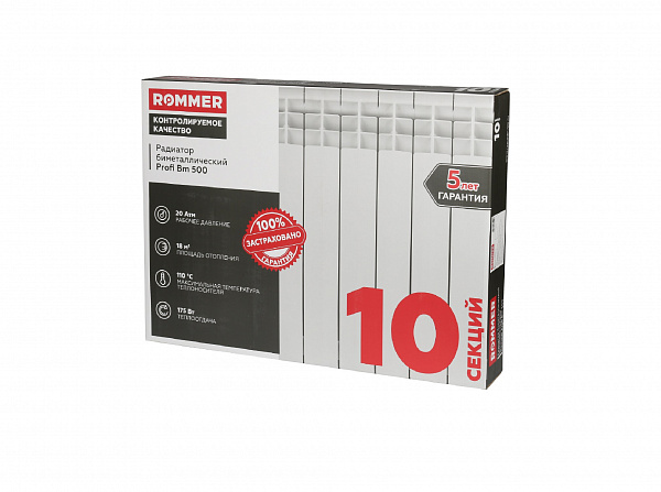 Биметаллический секционный радиатор для центральных систем отопления (квартира, офис и т.д.). Представляест собою алюминиевый радиатор с усиленным стальным коллектором, более стоиким к агрессивным теплоносителям. При высоте потолка 2.5 - 2.75 м и средних теплопотерях 10 секции Rommer Profi Bm с межосевым расстоянием 500 мм достаточно для обогрева 13-14 м?. Характеристики