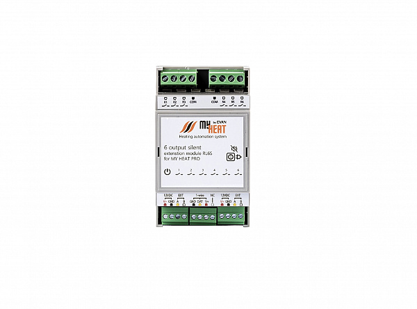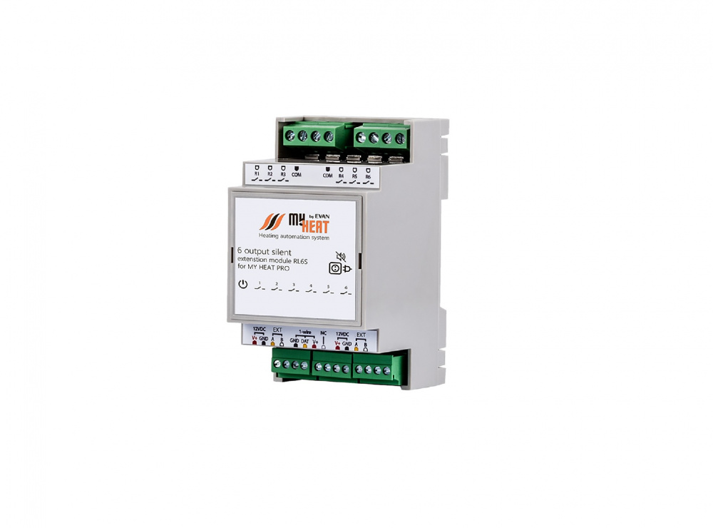 Модуль MY HEAT RL6S подключается к контроллеру по проводной шине и предназначен для бесшумной коммутации дополнительных шести выходов электрической нагрузки посредством симистора. Для связи с контроллером оснащен интерфейсом RS-485 (посредством внутреннего протокола MY HEAT). Модуль оснащен интерфейсом 1-wire для подключения шлейфа цифровых датчиков температуры. Ключевой особенностью модуля является встроенная функция ПИД-регулирования до 3-х контуров одновременно. Модули расширения предназначены для использования в автоматизированных системах отопления и горячего водоснабжения под управлением теплового контроллера MY HEAT. Модули расширяют возможности контроллера MY HEAT, предоставляя дополнительные функции, интерфейсы и порты ввода/вывода. Коммутация выходов электрической нагрузки посредством симистора.