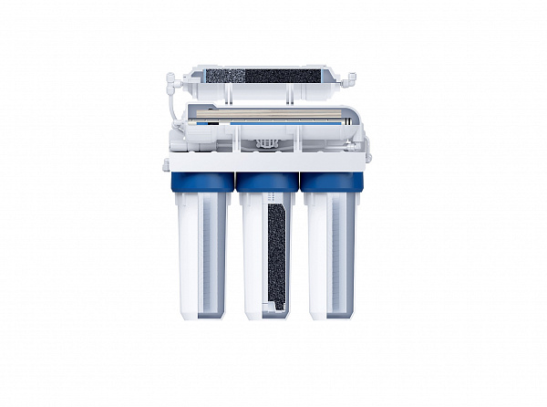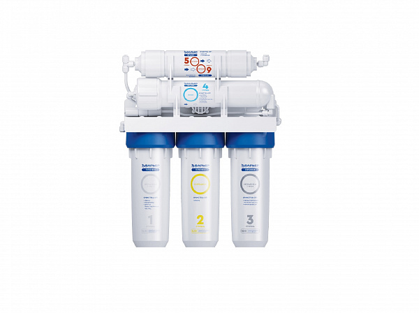 Пятиступенчатый фильтр обратного осмоса в корпусе классического исполнения. Вода проходит пять этапов очистки, что позволяет удалить все примеси и получить кристально чистую воду, не уступающую по качеству бутилированной. Фильтр ПРОФИ Осмо 100 состоит из: 1. БАРЬЕР ПРОФИ Механика 5 мкм – предварительная механическая очистка. Удаление ржавчины, песка и других примесей. 2. БАРЬЕР ПРОФИ Сорбцион – защита мембраны от хлора. 3. БАРЬЕР ПРОФИ Механика 1 мкм - финишная механическая очистка нерастворимых мелкодисперсных механических примесей размером до 1 мкм. 4. БАРЬЕР ПРОФИ Осмо 100 - обратноосмотическая мембрана на основе тонкоплёночного полиамидного композита с размером пор 0,0001 мкм пропускает только молекулы воды, за счет чего удаляются абсолютно все примеси. Производительность мембраны 100 галлон. 5. БАРЬЕР ПРОФИ Постфильтр – финишное кондиционирование после накопительной емкости. Удаление привкусов и запахов. Рабочее давление системы от 2,5 атм. Ресурс фильтрующей системы в целом до 12 месяцев, ресурс обратн Характеристики