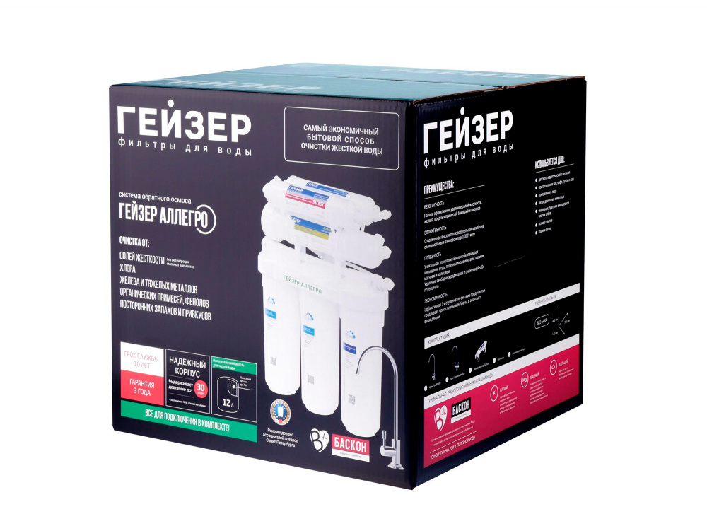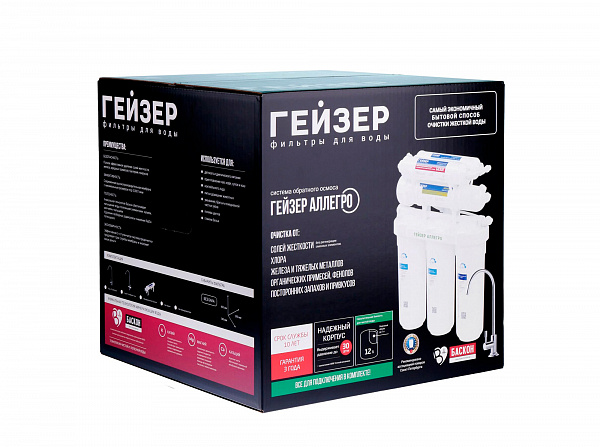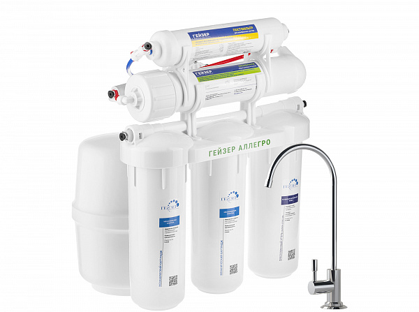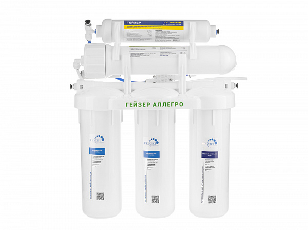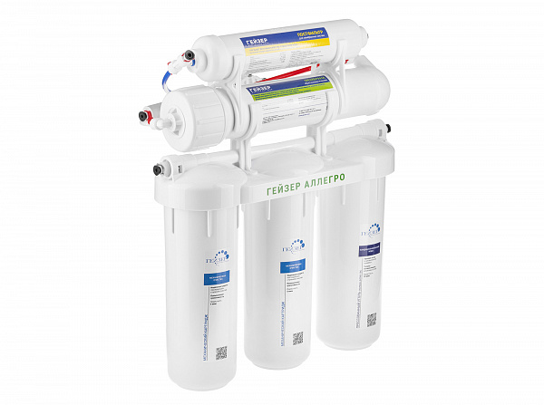 Технология обратного осмоса, использованная в фильтре Гейзер Аллегро, заключается в фильтрации воды через полупроницаемую мембрану. Размеры пор мембраны настолько малы, что пропускают только молекулы воды. Размер молекул большинства примесей, а также бактерий и вирусов значительно больше молекул воды, поэтому они не проходят через мембрану. Система работает при давлении в подводящей магистрали не менее 3 атм. Максимальная степень очистки воды, возможная в домашних условиях;