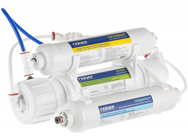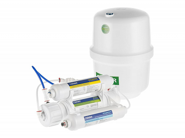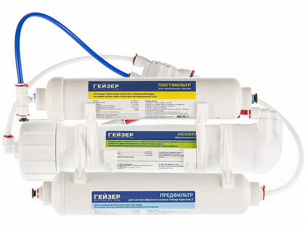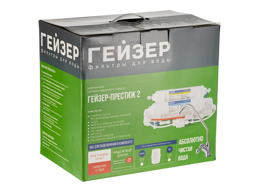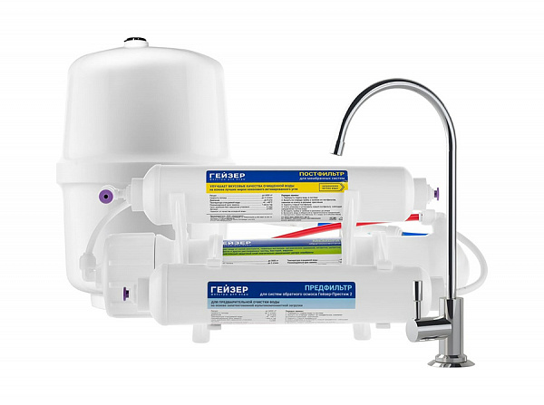 Система обратного осмоса Гейзер Престиж-2 с накопительным баком 12л 20042 способен очищать воду до питьевого уровня.