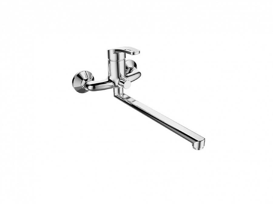 Смеситель среднего ценового сегмента для ванны с поворотным изливом и встроенным поворотным дивертором отличается от смесителей базового сегмента утяжеленным корпусом. В качестве запорной арматуры используется картридж типоразмера 40 мм. Длина излива составляет 330 мм, однако, учитывая длину крепежного комплекта, фактический вынос излива от стены составляет 378 мм. Максимальная высота смесителя от оси крепления составляет 107 мм. Встроенный дивертор не только уменьшает количество резьбовых соединений, но и делает смеситель менее громоздким. В комплектацию входит крепежный комплект, плоский излив из нержавеющей стали с никель-хромовым покрытием, двухпозиционный кронштейн для пристенного крепления лейки, большая лейка с ситом диаметром 100 мм и качественный хромированный шланг для душа с двойным замком и устойчивым к перепадам температур полимерным внутренним шлангом. Отличительной особенностью крепежного комплекта являются эксцентрики из нержавеющей стали 304 с шумоподавляющими вставками из нетоксичной EPDM-ре Характеристики