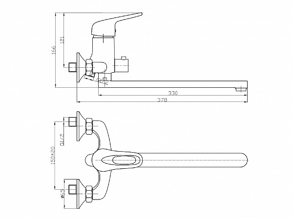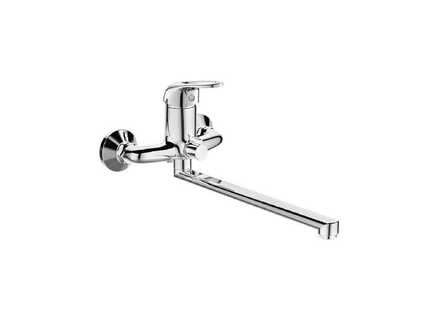 Смеситель базового сегмента для ванны с поворотным изливом и встроенным поворотным дивертором. В качестве запорной арматуры используется картридж типоразмера 40 мм. Длина излива составляет 330 мм, однако, учитывая длину крепежного комплекта, фактический вынос излива от стены составляет 378 мм. Максимальная высота смесителя от оси крепления составляет 85 мм. Встроенный дивертор не только уменьшает количество резьбовых соединений, но и делает смеситель менее громоздким. В комплектацию входит крепежный комплект, плоский излив из нержавеющей стали с никель-хромовым покрытием, двухпозиционный кронштейн для пристенного крепления лейки, большая лейка с ситом диаметром 100 мм и качественный хромированный шланг для душа с двойным замком и устойчивым к перепадам температур полимерным внутренним шлангом. Отличительной особенностью крепежного комплекта являются эксцентрики из нержавеющей стали 304 с шумоподавляющими вставками из нетоксичной EPDM-резины. Смеситель оснащен ручкой строгой формы без отверстия на рычаге. Характеристики