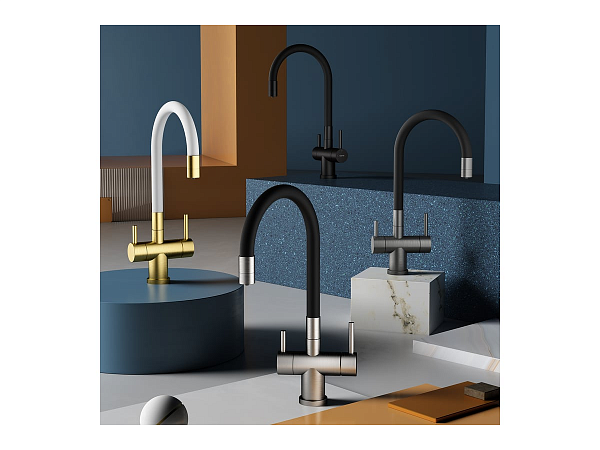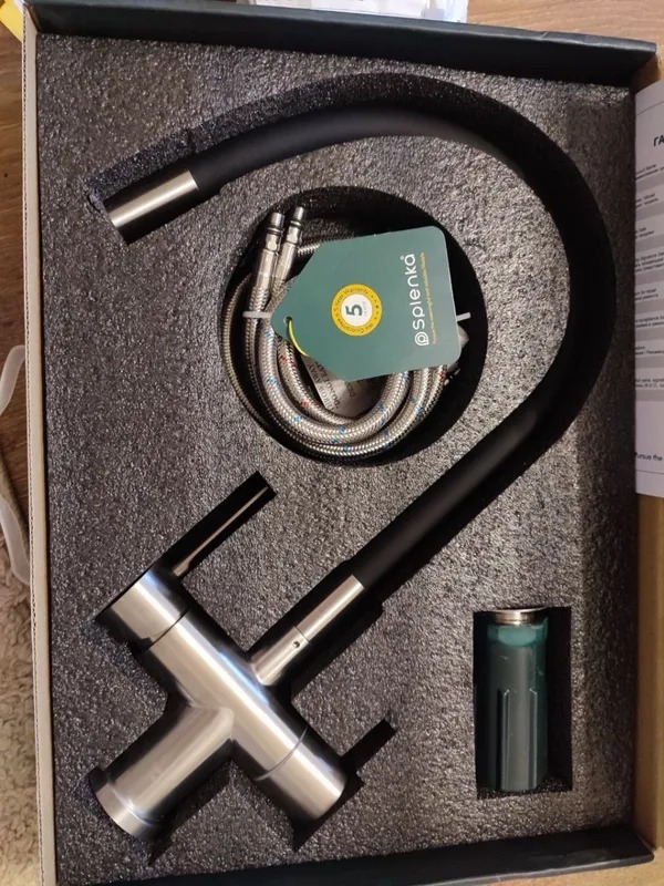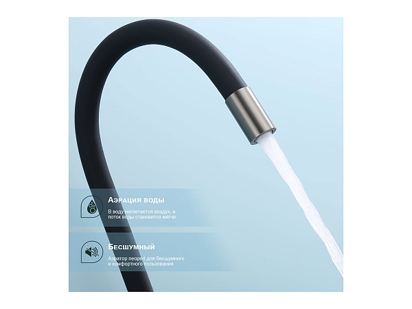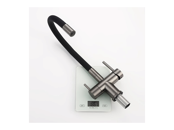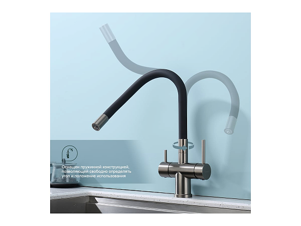 Смеситель для кухни с подключением к фильтру с гибким силиконовым изливом S70.64.09. Изготовлен из высококачественной нержавеющей стали. Данный сплав безопасен для здоровья, прочный и стойкий к коррозии. Покрытие смесителя создает гладкую полуматовую поверхность, которая эстетично выглядит, не оставляет пятен, не окисляется. Смесители для кухни с гибким изливом имеют необычный внешний вид и особую конструкцию. Нижняя часть представляет собой обычный однорукий латунный смеситель с регулировкой холодной и горячей воды, регулировкой напора и переключателем на фильтр с другой стороны. Верхняя часть это гибкий излив из пищевого силикона. С его помощью можно самостоятельно регулировать глубину выноса и высоту излива, что решает проблему при наполнении раковины посудой. Смеситель поворачивается на 360 градусов и оснащен отдельным выходом для фильтрованной воды. Переключение на воду из фильтра осуществляется переключателем с керамическим картриджем. Для монтажа достаточно иметь под рукой базовый набор инструментов. В Характеристики