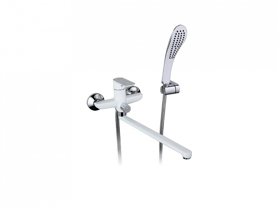 Смеситель для ванны белый с хромированными вставками и длиным поворотным изливом. Душевая лейка безрежимная. Переключение водянного потока поворотным дивертортором. Характеристики