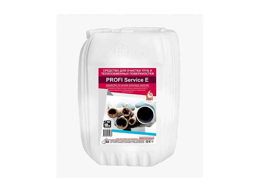 PROFI service Е - щелочное средство для химической очистки теплообменных поверхностей, выполненных из черных металлов, нержавеющих сталей и цветных металлов, от накипно-коррозионных отложений всех видов до 1000 г/м2. Выпускается в виде концентрата на основе щелочей, ПАВ и ингибиторов щелочной коррозии. Область применения: В процессе эксплуатации теплообменных систем на внутренних поверхностях водяного тракта образуются отложения. При соблюдении регламентируемого водного режима отложения состоят в основном из оксидов железа. При нарушениях водного режима и использовании для подпитки сетей некачественной воды в отложениях могут присутствовать также (в количестве от 5% до 20%) соли жесткости (карбонаты), соединения кремния, меди, фосфатов. Эксплуатационная химическая очистка предназначена для удаления с внутренней поверхности теплообменных поверхностей образовавшихся отложений. Она должна производиться при загрязненности поверхностей нагрева 800- 1000 г/м2 и более или при увеличении гидравлического сопротивления Характеристики
