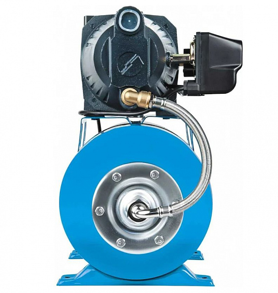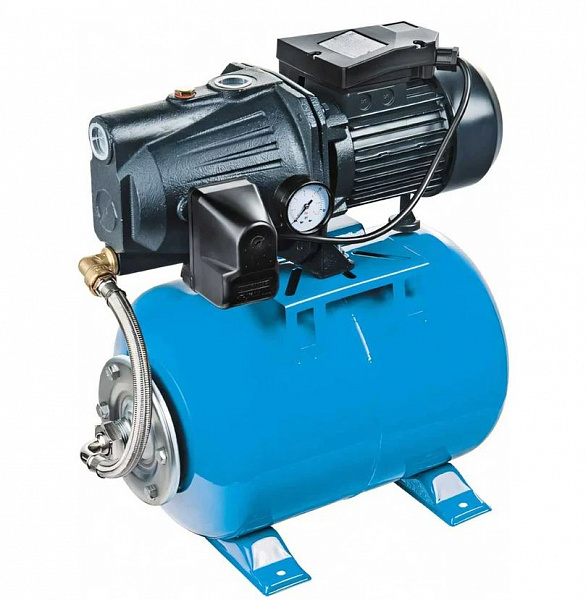 Станция автоматического водоснабжения состоит из насоса, 24-х литрового гидроаккумулятора и автоматического реле. Центробежный поверхностный насос c удлиненным встроенным эжектором JET L, электрической мощностью 1100 Вт, позволяет поднимать (засасывать) воду с глубины до 8 метров и создает давление воды после себя ~5.3 атм (53 метров).