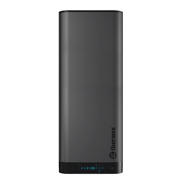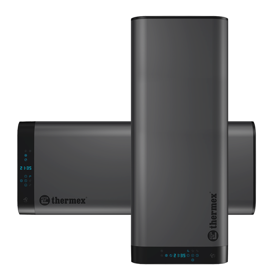 - Современные функции и приятный интерфейс. На фронтальной стороне водонагревателя расположена универсальная панель управления – показания времени и температуры автоматические меняют расположение в зависимости от монтажа бака. Управление полностью электронное и интуитивно-понятное: индикации на панели показывают режим работы, температуру и возможность настройки до градуса, текущее время, работу режимов защиты. А благодаря технологии Wi-FI Motion функционал работы становится более широким. Через приложение Thermex Home пользователь может из любой точки мира настроить алгоритм работы по дням или часам, установить таймер, а также подключить к голосовому помощнику Алиса.
