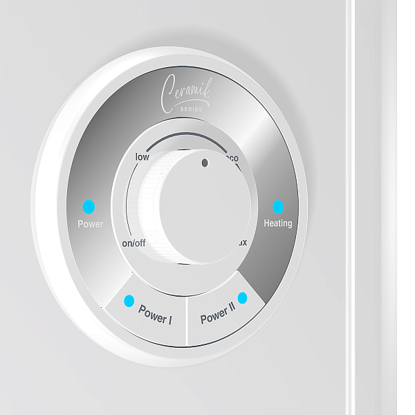 - Удобное механическое управление. На фронтальной панели Thermex Ceramik расположена панель управления - механический регулятор температуры и кнопки переключения режимов мощности. На температурной шкале предусмотрена отметка Eco - оптимальное сочетание нагрева воды и расхода электроэнергии. При этом механические настройки сохраняются после отключения водонагревателя и в случае перебоя в электросети;