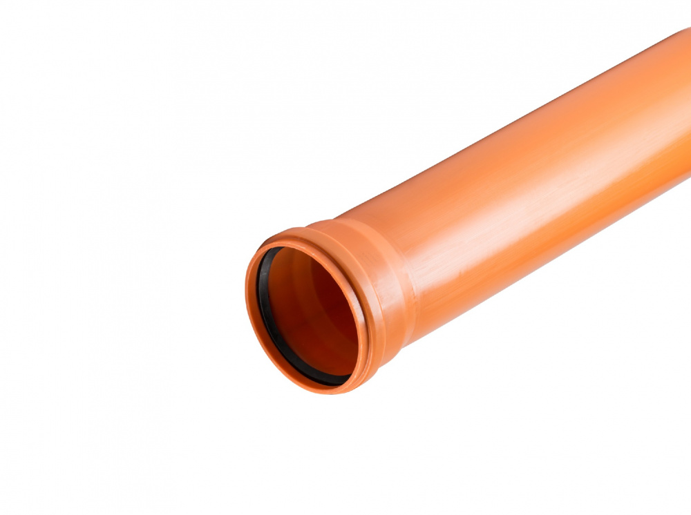 Труба для наружной канализации, полипропиленовая диаметром 110 мм с толщиной стенки 3,4 мм. Класс кольцевой жесткости SN4 позволяет заглублять трубопровод в естественный плотный грунт с хорошим сцеплениемгрунт (с небольшой интенсивностью движения транспорта) на глубину не более 6 метров. Длина без ратруба 2,0 м, с раструбом 2,06 м. Цвет - рыжий. Характеристики