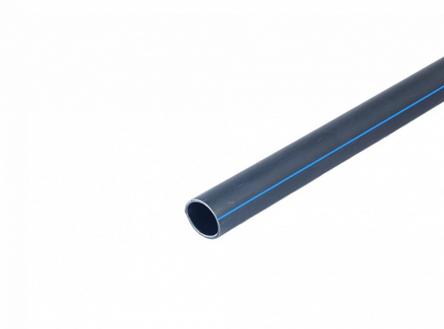 Труба полиэтиленовая ПЭ100 для холодного водоснабжения с наружним диаметром 25 мм и толщиной стенки 2,0 мм SDR13,6 (внутренний диаметр 21 мм, внутренний объем 1 метра трубы 0,346 л.) Изготовлена в соответствии ГОСТ 18599-2001. Рабочая температура – до +40°С (кратковременно до +80°С). Номинальное давление при +20°С - 12,5 атм. Цвет: Черный с синей полосой. Труба ПНД поставляется бухтами по 200 метров. Характеристики