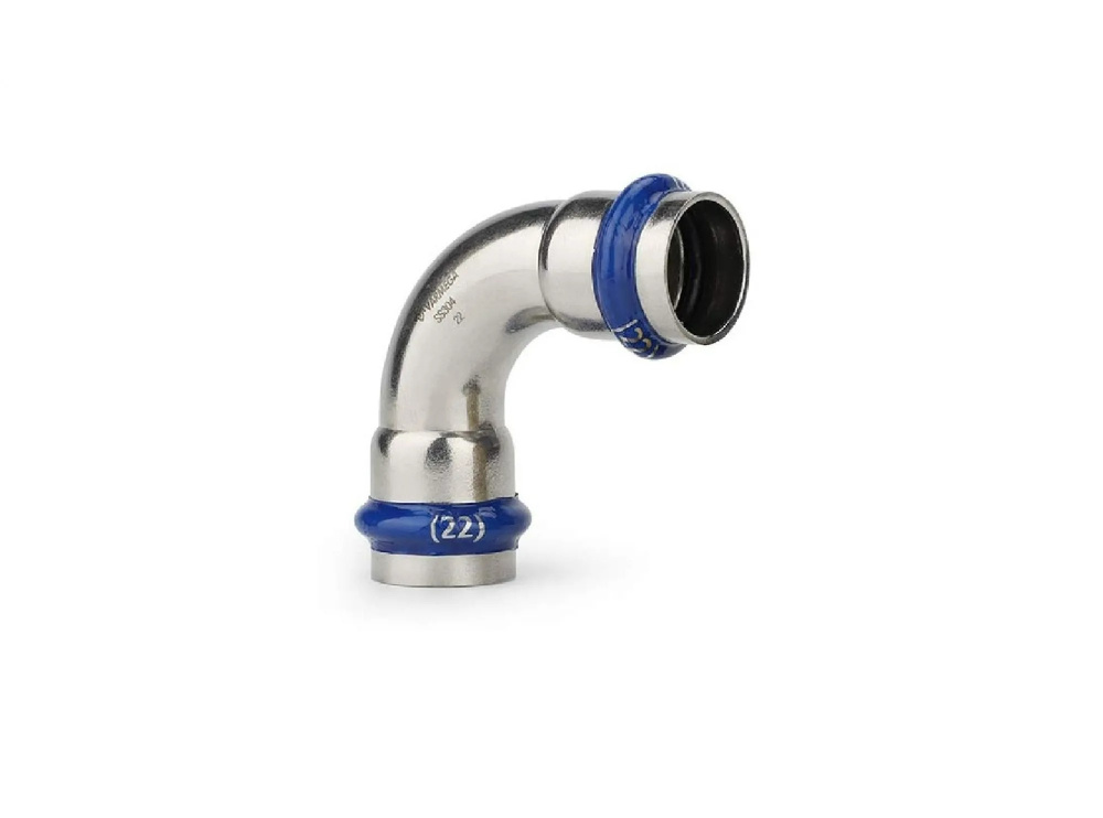 Угольник 90° двухраструбный Varmega Inox Press используется для соединения труб равных диаметров под углом 90 градусов. Для получения надежного неразъемного соединения трубы и фитинга потребуется специальный пресс-инструмент с насадками типа профиль «V».