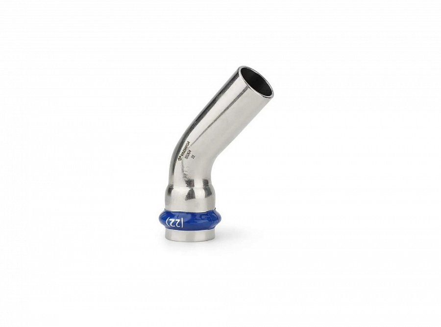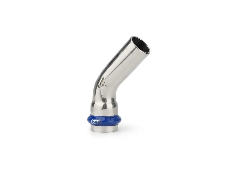Угольник 45° однораструбный Varmega Inox Press используется для соединения труб и фитингов равных диаметров под углом 45 градусов. Для получения надежного неразъемного соединения трубы и фитинга потребуется специальный пресс-инструмент с насадками типа профиль «V».