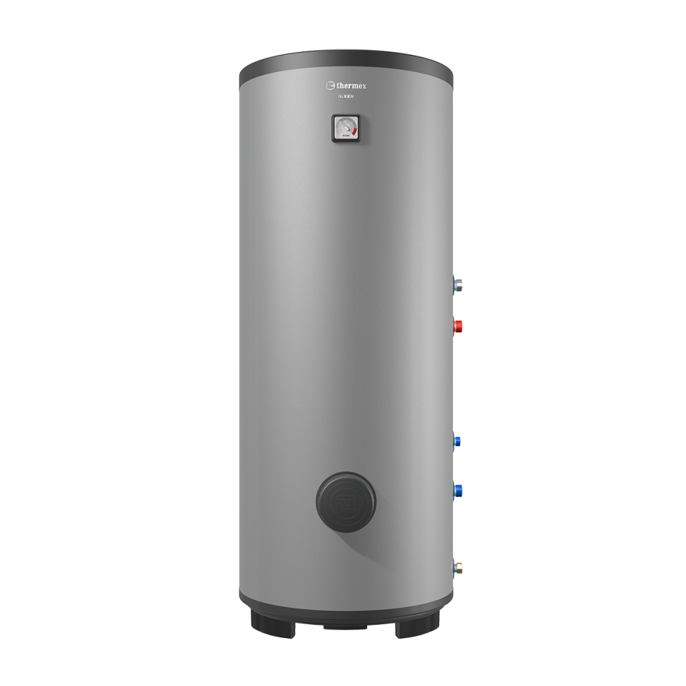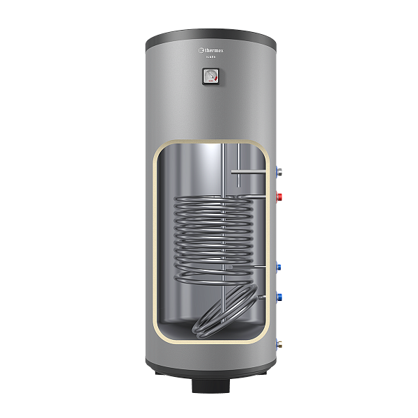 - Один водонагреватель – два варианта нагрева. Водонагреватель косвенного нагрева Nixen осуществляет нагрев за счет тепла системы отопления. Внутри установлен теплообменник из нержавеющей стали: модели объемом 150 и 200 литров оснащены теплообменниками мощностью 17 000 Вт, 250 литров – 19 000 Вт и 300 литров – 24 000 Вт. Дополнительно можно установить нагревательный элемент мощностью 6 000 Вт, а также панель управления. Таким образом, Thermex Nixen можно эксплуатировать как водонагреватель с косвенным нагревом или превратить его в бойлер комбинированного типа.