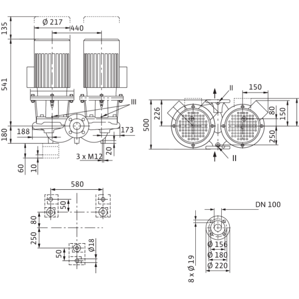 Линейный сдвоенный насос с двумя одноступенчатыми центробежными насосами с сухим ротором в общем корпусе с перекидным клапаном для установки в трубах или на фундаменте. Фланцевая заглушка корпуса и консоли предоставляются за отдельную плату. Блочное исполнение с низким уровнем шума и вибрации с промежуточным корпусом и неподвижно присоединенным унифицированным (стандартным) электродвигателем с фланцевым креплением. С не зависящим от направления вращения скользящим торцовым уплотнением в кожухе с принудительным охлаждением и снижающим кавитацию рабочим колесом. Фланцы имеют отверстия R 1/8 для измерения давления. На корпус насоса и промежуточный корпус нанесено катафорезное покрытие.